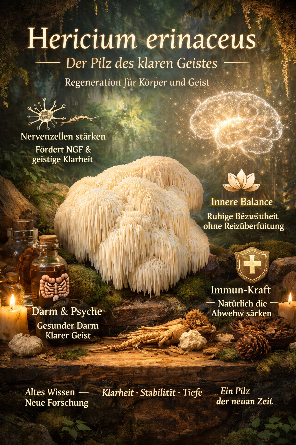 Aus schamanischer Perspektive ist Hericium ein Pilz der inneren Ordnung – er klärt nicht, indem er antreibt, sondern indem er beruhigt und strukturiert wird.
